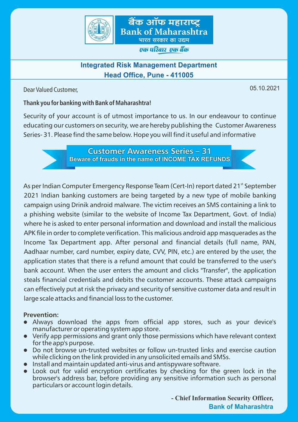 - Customer Awareness Series - 31 (Beware of frauds in the name of INCOME TAX REFUNDS)