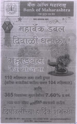 Bank of Maharashtra use cookies to enhance your experience on Bank’s website. Read More... By using our website, you agree to place these cookies on your device. You can disable/delete these cookies by changing your web browser settings. Bank of Maharashtra is not responsible for cookies placed in the device of user/s by any other website and information collected thereto. Check out our Cookie/Privacy Policy and Terms & Conditions.